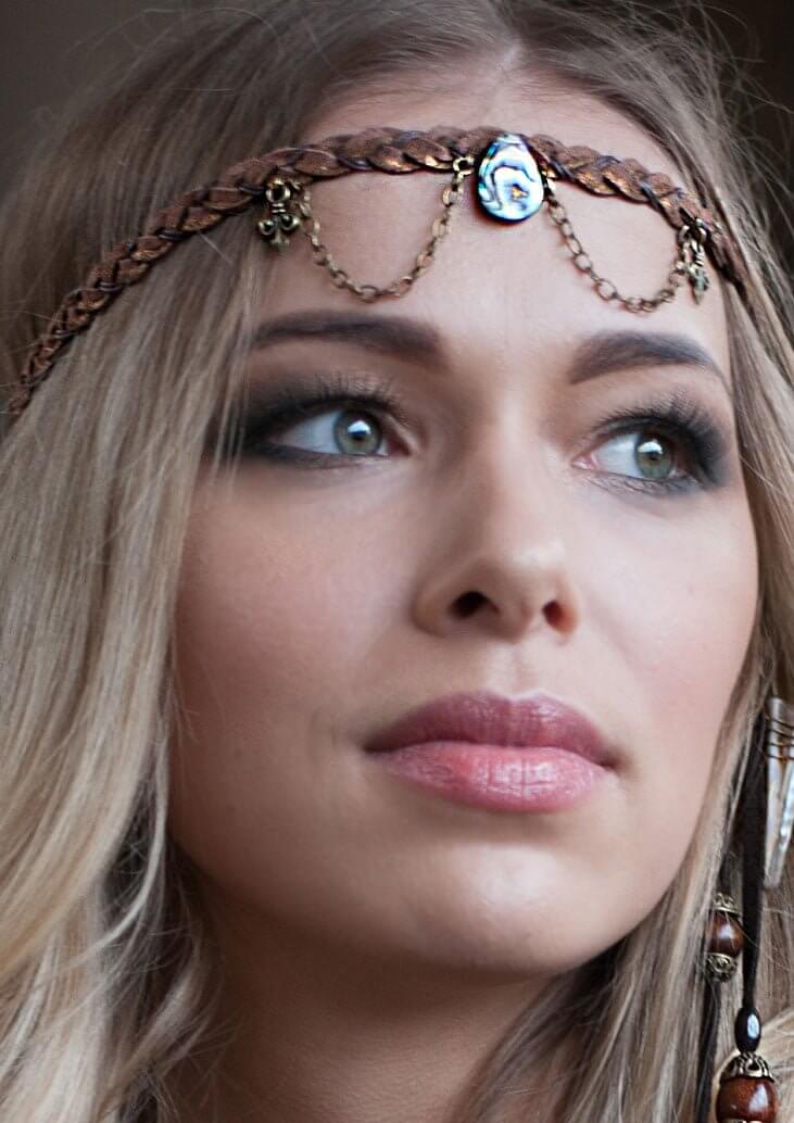 El punto central de este impresionante tocado es la concha Paua de Nueva Zelanda, que actúa como un tercer ojo,