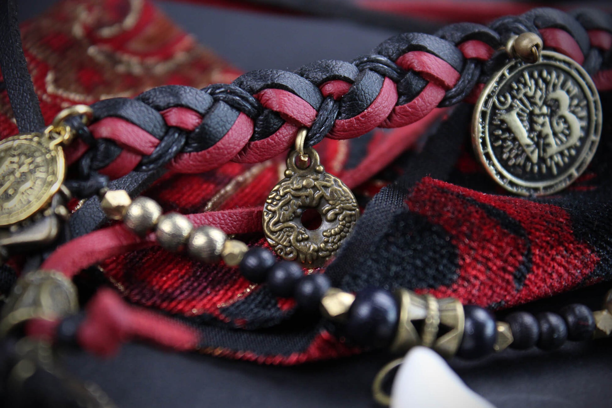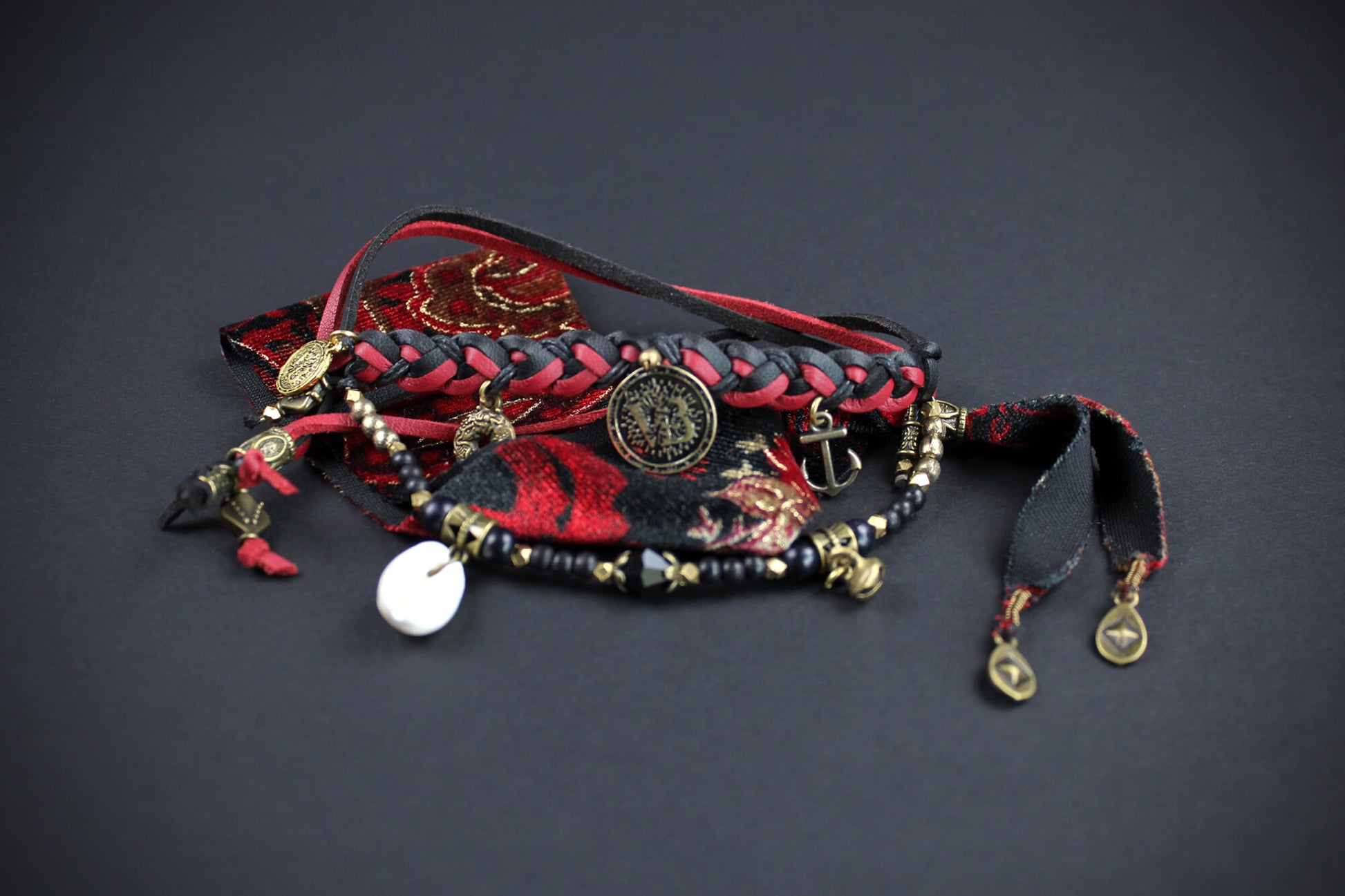Fabricado con gamuza sintética con fines éticos, una pieza destacada es la antigua moneda tribal Kuchi y una selección de dijes de bronce antiguos....