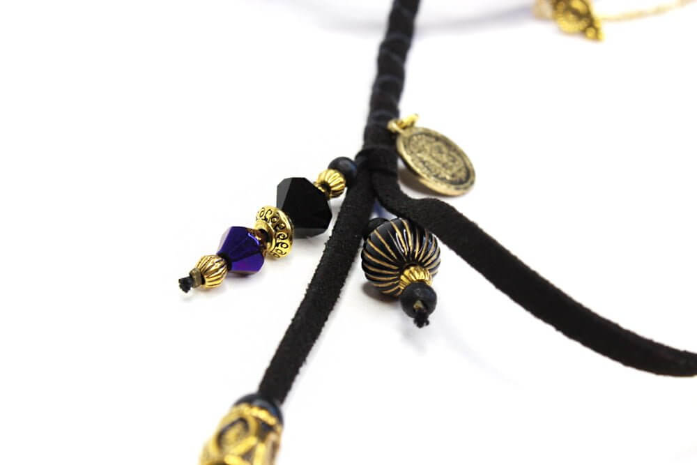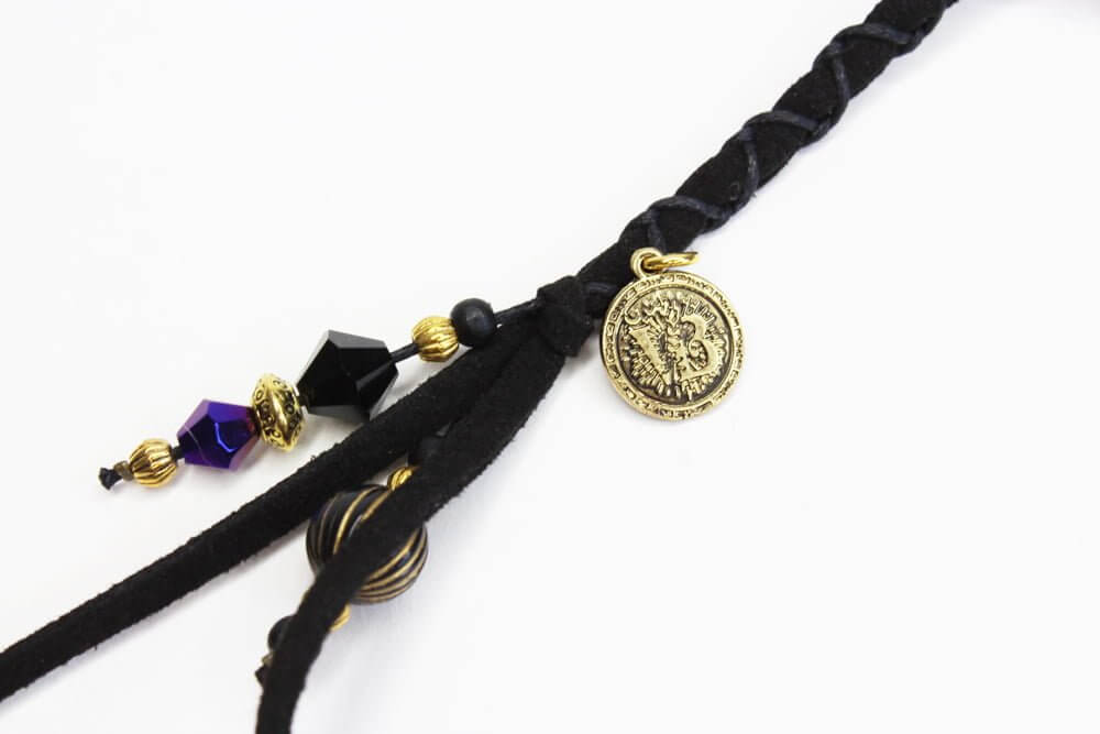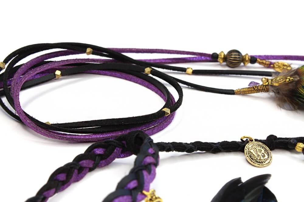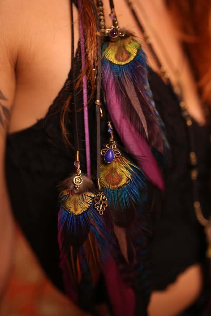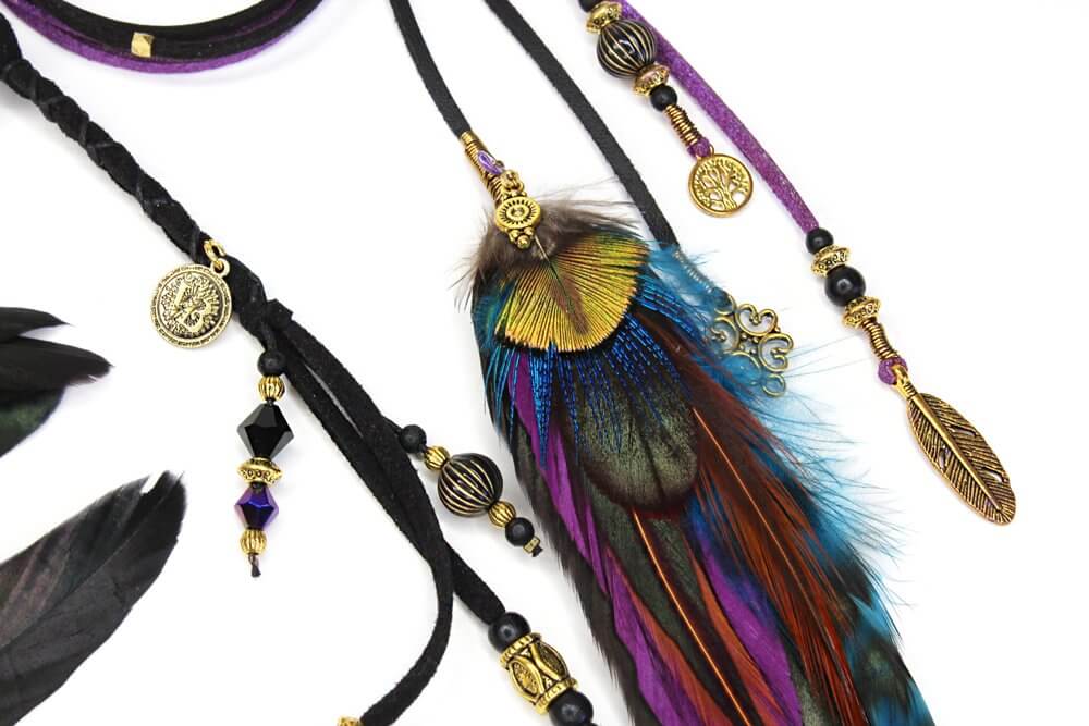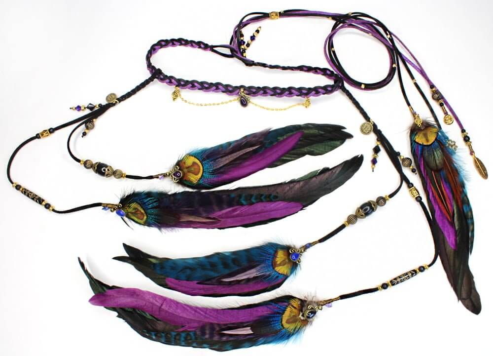 A cada lado del tocado, hemos fijado plumas dobles que caen en cascada. Cada una con su propio y complejo bordado a lo largo de la gamuza sintética, que luego conduce hasta las plumas. Hemos usado una combinación de plumas de faisán, gallo y pavo real en cada pluma, con un colgante de lapislázuli y otro de amatista a cada lado.