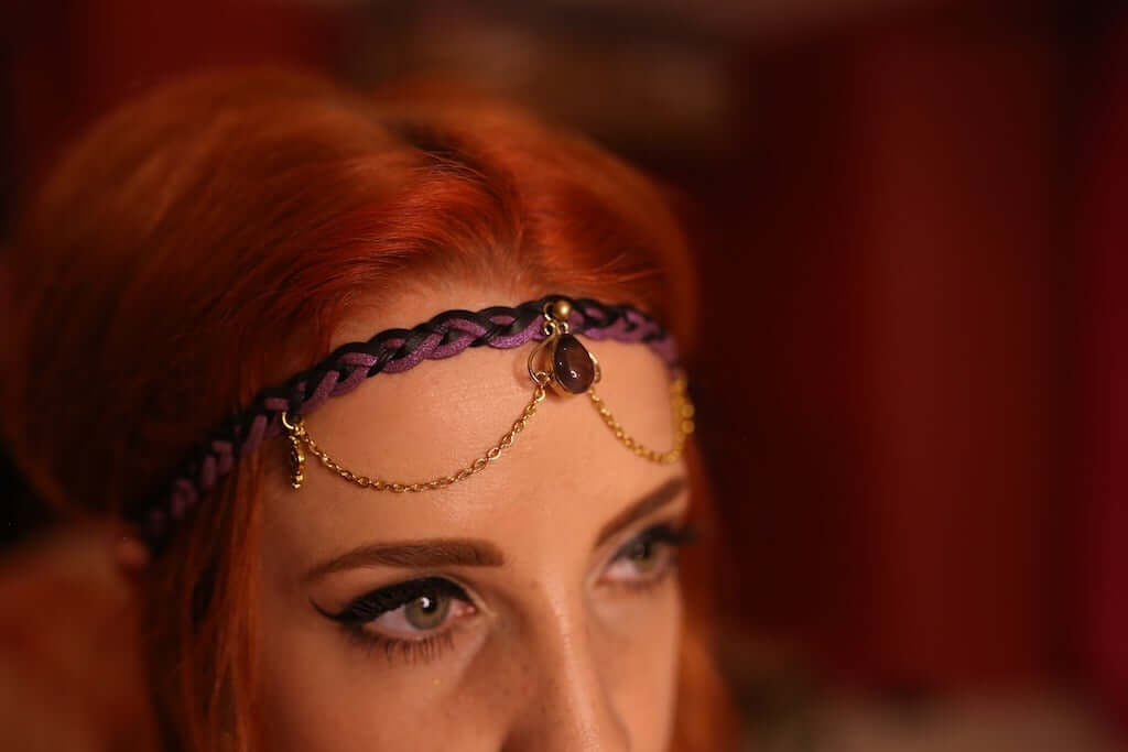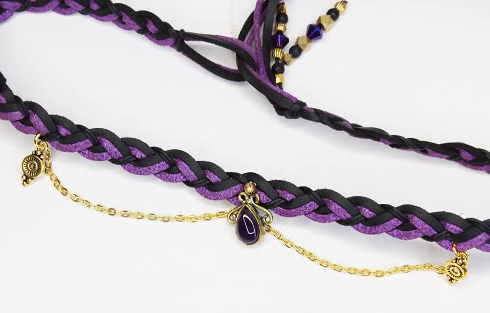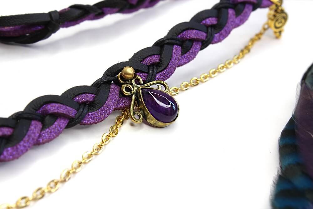 El Tocado de Plumas Lluvia Púrpura ha sido meticulosamente diseñado con colgantes de lapislázuli y amatista. El colgante de amatista sirve como punto central para la parte frontal del tocado.