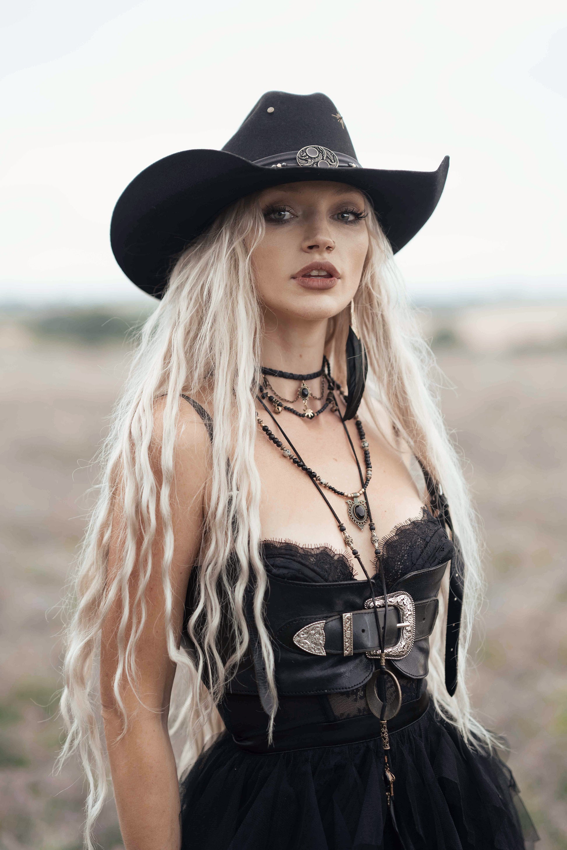 Con una banda de tela con efecto de cuero negro con un concho característico y detalles de ónix negro.